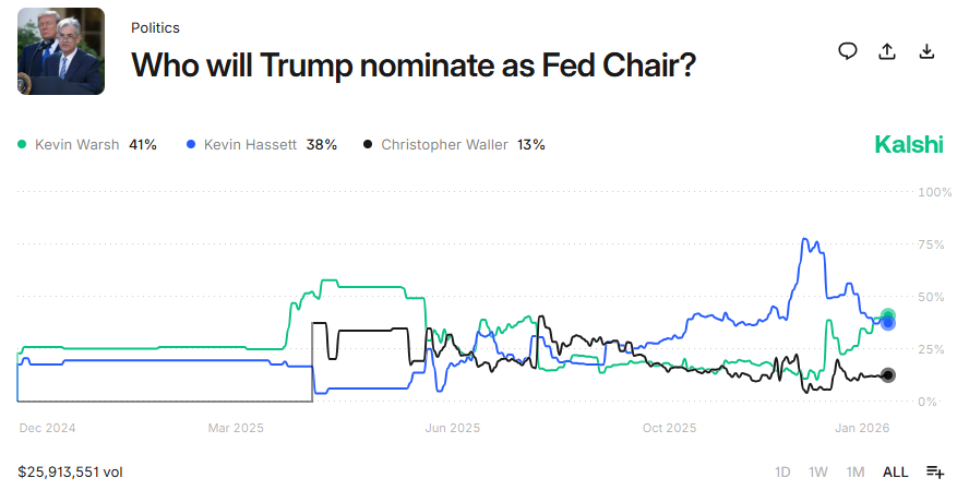 預測市場Kalshi顯示,沃什當選美聯儲主席的概率目前爲41%、哈塞特爲38%,沃勒13%。