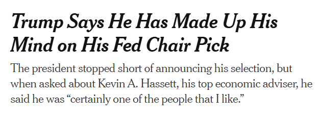 特朗普在接受《紐約時報》採訪時稱:「我已經在腦子裏做出了決定。我還沒有跟任何人談過。」當被問及白宮國家經濟委員會主任、其首席經濟顧問凱文·哈塞特(Kevin A. Hassett)是否爲候選人時,特朗普並未正面回答,只表示「我不想說」,但同時強調哈塞特「當然是我喜歡的人之一」。特朗普的表態顯示,白宮對美聯儲最高職位的遴選已經進入最後階段,但在正式宣佈前仍保持高度謹慎與保密。