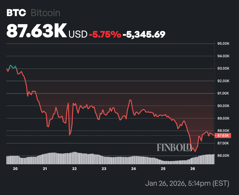 比特幣週一報87,623美元,日內下跌逾1%,周度累計跌近6%。