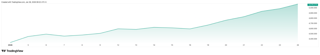 黃金目前交投於5,000美元/盎司上方的歷史高位,仍是表現最強的宏觀資產之一。