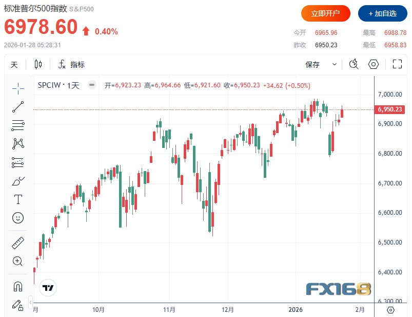 FX168財經報社(北美)訊 美國股市週二(1月27日)延續「分化行情」。在大型科技股走強、市場押注AI敘事仍將主導本週財報季的背景下,標普500指數盤中刷新歷史新高,納指同步上揚;但醫療保險板塊因醫保支付提案引發集體跳水,聯合健康大跌拖累道指走弱。與此同時,投資者正把焦點轉向週三出爐的美聯儲年內首次利率決議,市場普遍預計聯儲將維持利率不變,但更關注對未來降息路徑的信號。