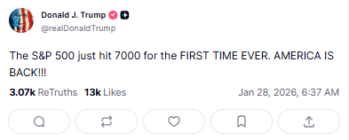 「標普500指數剛剛首次觸及7000點。美國回來了!!!」特朗普週三在其社交平臺Truth Social上寫道。