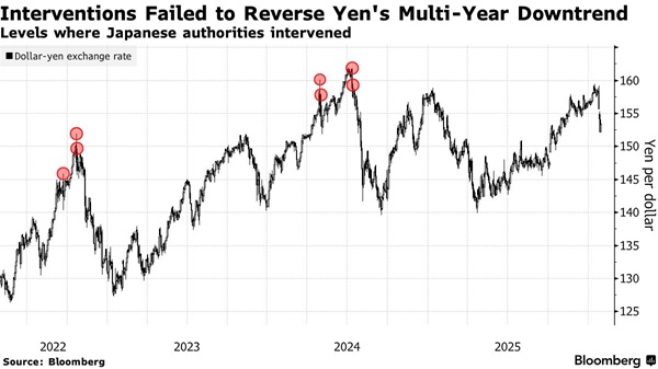 歷史經驗表明,單邊行動只能提供暫時的緩解。日本在2024年四次干預日元匯率,每次都短暫提振日元,但未能扭轉多年來日元持續下跌的趨勢,市場不斷考驗着決策者的決心。