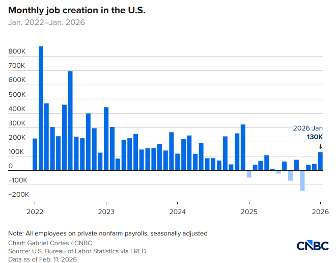 由於2月3日結束的部分政府停擺導致數據發佈推遲近一週,這份報告整體仍與「低增長模式」的勞動力市場相一致,不過僅零星顯示裁員增加的跡象。1月是自2024年12月以來非農增幅最強的一個月;此前一年(2025年)就業增幅月均僅約1.5萬人。