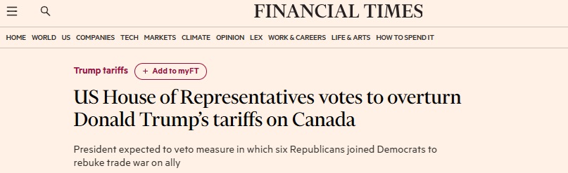 FX168財經報社(亞太)訊 美國衆議院投票推翻美國總統特朗普(Donald Trump)對加拿大徵收的關稅,英國《金融時報》稱,此舉被視爲對特朗普標誌性經濟政策的重大否定。