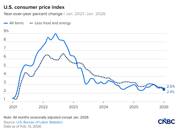 美國勞工統計局(BLS)週二(2月13日)公佈的數據顯示,整體CPI環比上漲0.2%,低於市場預期的0.3%;同比增速回落至2.4%,不及預期的2.5%,並刷新去年5月以來的最低同比漲幅。若回看自2021年春季通脹加速上行以來的走勢,本次讀數僅略高於去年4月的階段性低點2.3%,表明通脹回落動能仍在延續。