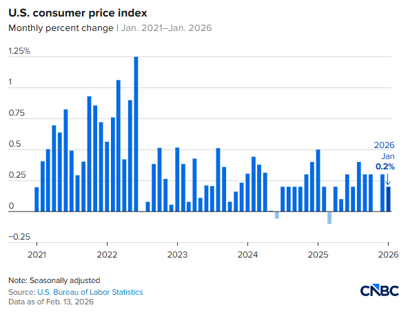 FX168財經報社(北美)訊 美國通脹再度釋放「降溫」信號。最新數據顯示,1月整體CPI環比僅升0.2、同比回落至2.4%,均低於市場預期;剔除食品與能源後的核心CPI同比降至2.5,創2021年3月以來最低水平,接近疫情前區間。數據公佈後,市場對美聯儲年內寬鬆的押注明顯升溫,交易員預計4月前降息概率約30%,而6月前啓動降息的可能性已躍升至80%。