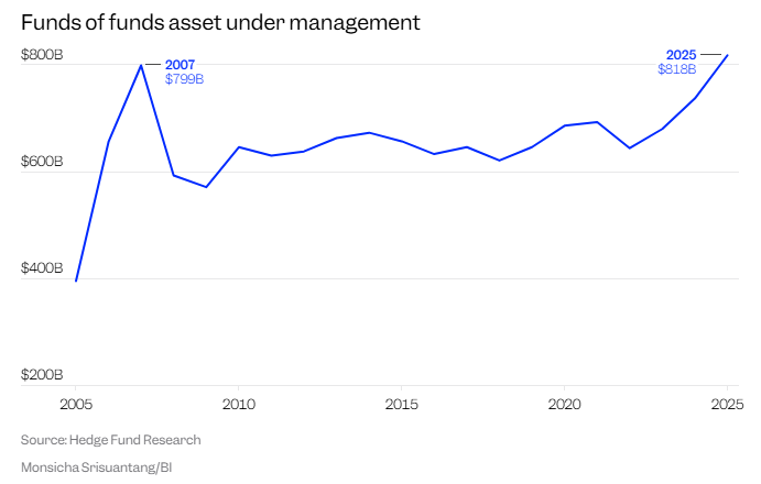 根據Hedge Fund Research(HFR)的數據,截至2025年底,基金中的基金管理資產規模已達到8180億美元。這是這家長期行業追蹤機構記錄以來的最高水平,也是該行業首次超過2007年底創下的7990億美元歷史高位。