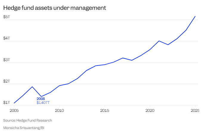 儘管如此,2008年那場「大規模出走」的影響仍然存在。根據Hedge Fund Research的數據,2007年時市場上接近2500只基金中的基金;而截至2025年底,這一數量已不足1000只。