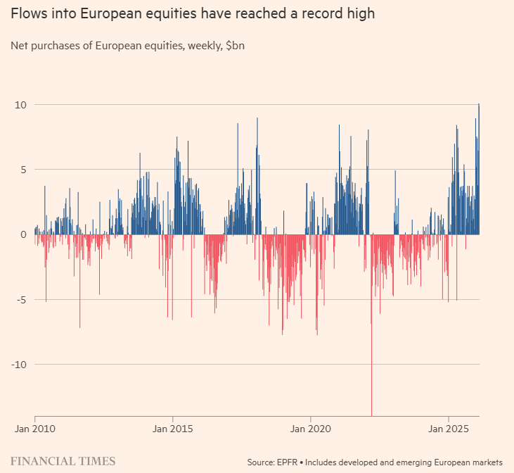 追蹤交易所交易基金(ETF)及共同基金流量的數據提供商 EPFR 的數據顯示,在連續兩週出現約 100 億美元的紀錄級流入後,歐洲股票有望在2月錄得史上最高單月資金流入量。