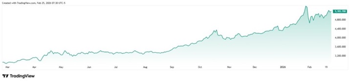 僅過去12 個月,金價就大漲了驚人的75.59%;而從2023年8月到截至發稿時的2026年2月25日,金價從約1900美元/盎司飆升至5184美元/盎司,累計上漲172%。