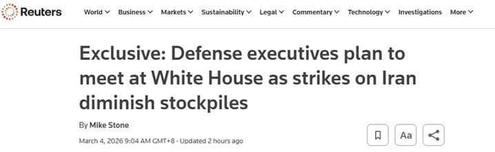 FX168財經報社(亞太)訊 英國路透社週三(3月4日)發佈獨家報道稱,五位知情人士向路透社透露,特朗普政府計劃於週五在白宮與美國最大國防承包商的高管會面,討論加速武器生產事宜。眼下五角大樓正在努力補充庫存,因爲伊朗打擊和其他幾次軍事行動已消耗了大量彈藥。