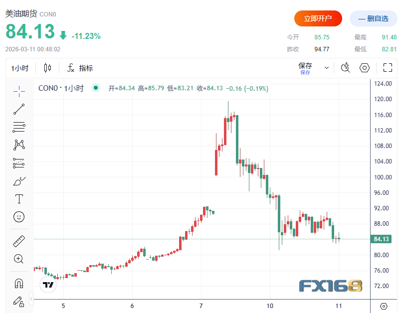 此前,在美國與以色列對伊朗發動空襲之後,油價一度在週日晚間突破100美元,並在短時間內飆升至接近119美元/桶。不過,在美國總統特朗普表示衝突可能很快結束之後,市場迅速解除「戰爭溢價」,油價隨即大幅回落。