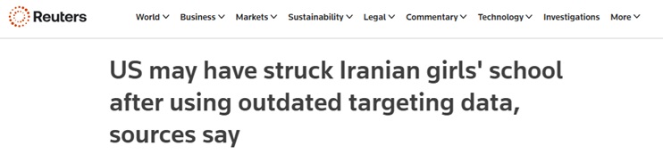 #伊朗危機追蹤#FX168財經報社(亞太)訊 英國路透社週四(3月12日)報道稱,兩名知情消息人士週三向路透社表示,導致數十名兒童死亡的伊朗一所女子學校遇襲事件,可能是由於美方使用了過時的目標定位數據所致。