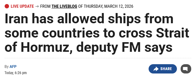 FX168財經報社(北美)訊 伊朗副外長馬吉德·塔赫特-拉萬奇(Majid Takht-Ravanchi)週四(3月12日)表示,伊朗已允許部分國家的船隻通過霍爾木茲海峽,並否認伊朗在該戰略航道佈設水雷。在相關消息傳出後,國際油價漲幅明顯收窄。