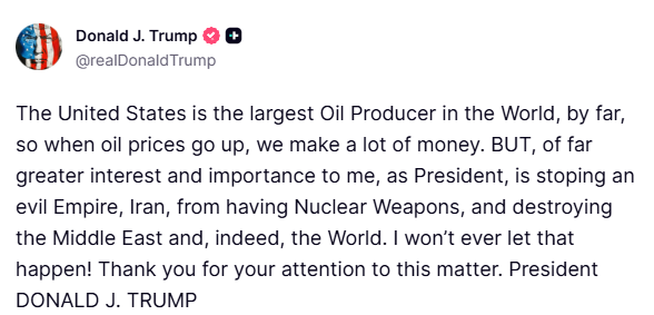 在此期間,美國總統特朗普也發表聲明,試圖緩和市場對油價飆升的擔憂。他表示,美國是「世界上最大的石油生產國」,油價上漲在經濟上對美國有利,但「對我來說,更重要的是阻止伊朗這個邪惡帝國」。特朗普還表示,美國的目標是阻止伊朗獲得核武器,並防止其「摧毀中東甚至世界」。