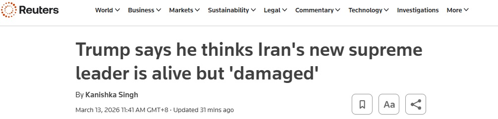 #伊朗危機追蹤#FX168財經報社(亞太)訊 英國路透社週四(3月13日)最新報道稱,美國總統特朗普(Donald Trump)表示,他認爲新任伊朗最高領袖穆傑塔巴·哈梅內伊(Mojtaba Khamenei)仍然活着,但已「受損」。其父親、前任最高領袖,在美以對伊朗開戰的第一天被殺。