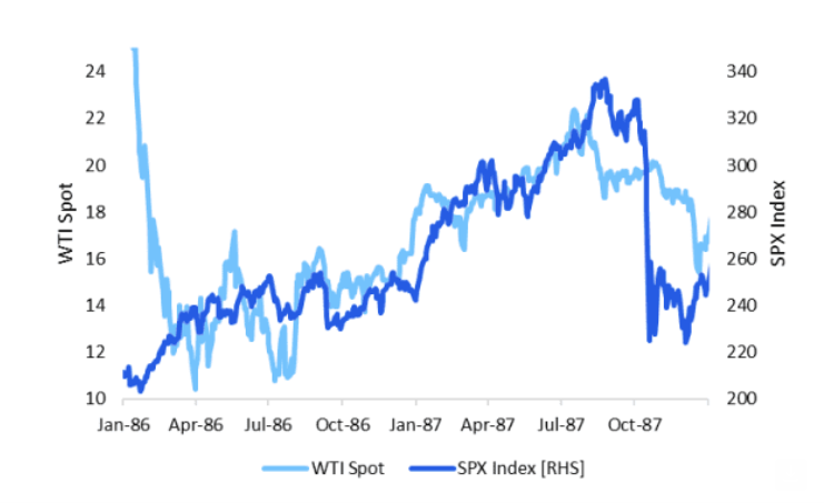 從市場表現來看,這一歷史參照也頗具啓發意義。數據顯示,油價曾在1987年7月一艘美國軍艦觸雷後見頂,而標普500指數在當時油價上漲過程中總體仍然錄得上行,即便那個階段也包括後來著名的「黑色星期一」股災。