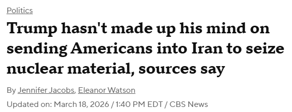 FX168財經報社(北美)訊 隨着美伊衝突持續升級,美國總統特朗普是否進一步擴大軍事行動,正成爲市場與外交層面最受關注的焦點。多家媒體最新披露,特朗普尚未決定是否派遣美軍進入伊朗境內,奪取該國高濃縮鈾等核材料;與此同時,美方正向中東增派約2500名海軍陸戰隊,外界普遍認爲,這意味着美國已在爲更復雜、風險更高的下一階段行動做準備。