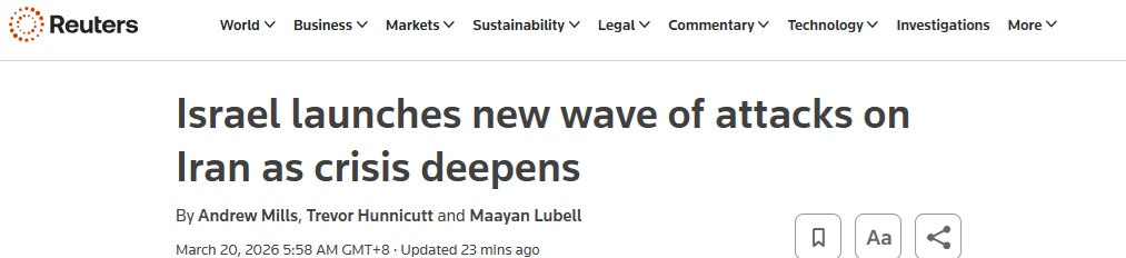 FX168財經報社(亞太)訊 英國路透社週五(3月20日)最新報道稱,在危機加深之際,以色列週五對伊朗發動了新一輪襲擊。此前一天,美國總統特朗普(Donald Trump)曾要求以色列不要再次打擊伊朗的天然氣基礎設施;而相關打擊已使美國和以色列針對伊朗的戰爭顯著升級。