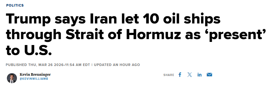FX168財經報社(北美)訊 美國總統特朗普週四(3月26日)表示,伊朗本週允許10艘油輪通過霍爾木茲海峽,稱此舉是送給美國的「禮物」,旨在展示其談判誠意。在美伊就結束中東衝突的談判前景依然充滿不確定性的背景下,這一罕見舉動被市場視爲潛在緩和信號。不過,雙方在停火條件、海峽控制權等核心問題上仍存在明顯分歧。