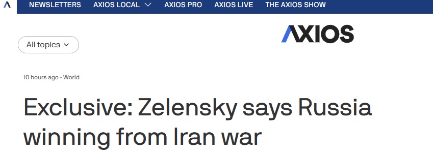澤連斯基通過Zoom對Axios表示:「我確信俄羅斯希望戰爭長期持續。他們有好處:美國的注意力集中在中東,可能減少對烏克蘭的軍事援助。制裁部分解除。我看到伊朗戰爭持續對俄羅斯只有好處。」