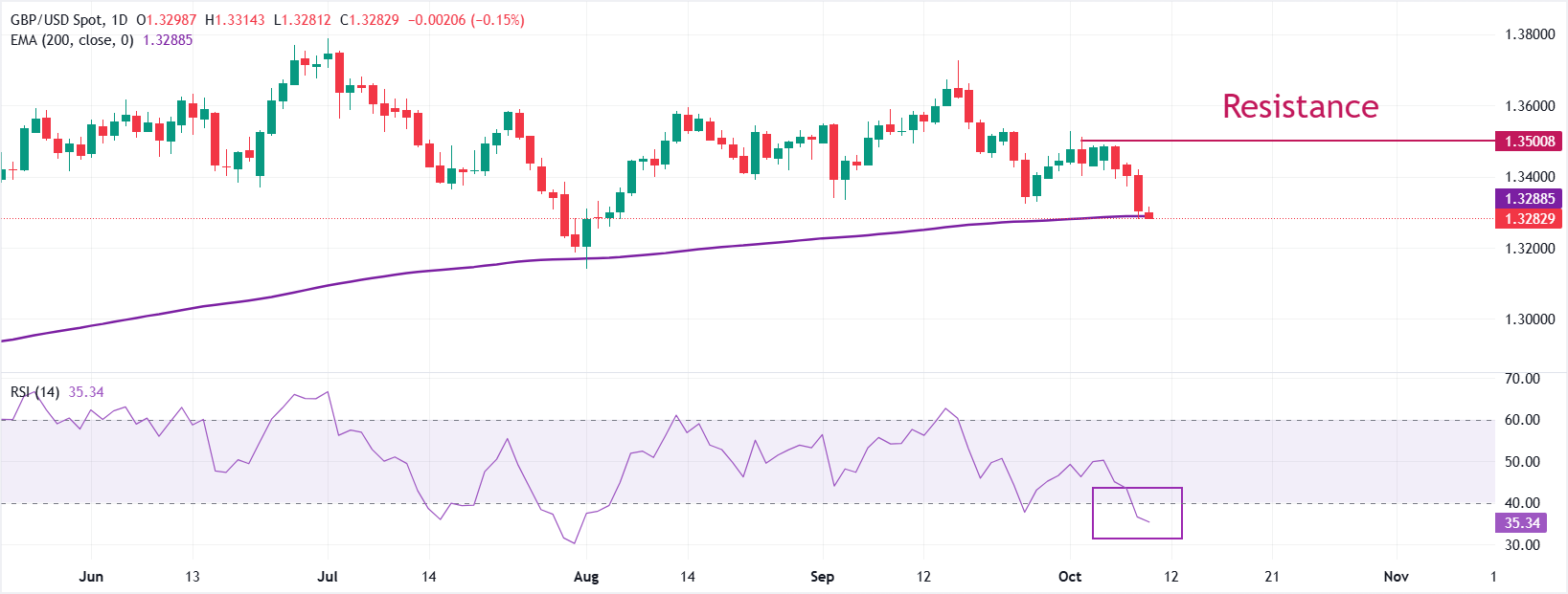 週五,英鎊兌美元進一步下跌至接近1.3300,為一個月以來的最低水平。英鎊/美元的整體趨勢變得不確定,跌至接近200日指數移動均線(EMA),該均線交易在1.3280附近。