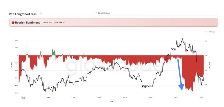 他補充道:「我們的比特幣多空偏好圖表追蹤Hyperliquid最大比特幣交易員的淨持倉。自10月6日起,淨空頭大幅上升,且早於週五事件發生。」