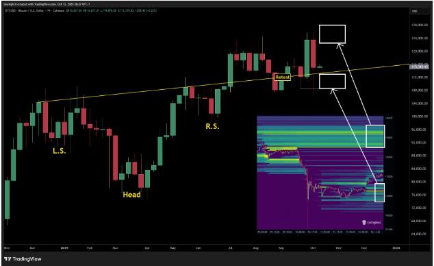 「Tradfi或許需要機會再測試低點,108.5至113區間有流動性,111中段附近集中度較高。上方熱點區間在123-128,126萬曆史高點附近爲流動性集中區。」