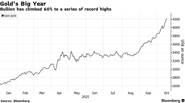 美國政府持續停擺同樣支撐了黃金市場,而所謂的「貶值交易」也發揮了作用。在這種交易中,投資者爲了防範失控的財政赤字,會拋售主權債券和貨幣,轉而投資避險資產。