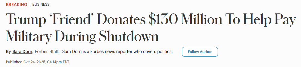 特朗普總統週四在公開場合宣稱,這筆捐款來自「我的一位朋友」,目的在於幫助彌補政府關門期間軍人薪資缺口。但他拒絕透露捐贈者姓名,僅表示「他並不想出名」。