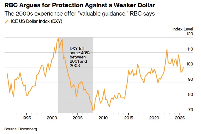 爲對衝美元價值長期下跌的風險,RBC建議交易員採用多種策略——從ICE美元指數的合成看漲期權,到針對歐元和日元的看漲二元期權。