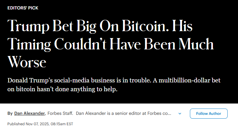 然而半年後,這一豪賭似乎成了「高位入場」的典型案例。自7月特朗普傳媒完成購入以來,比特幣價格下跌約 12%,讓特朗普本人損失慘重。