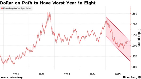 彭博美元指數2025年迄今已下跌約7%,有望創下八年來最糟糕的一年。