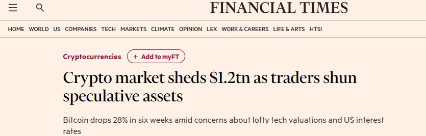 #NFT與加密貨幣#FX168財經報社(亞太)訊 英國《金融時報》週二(11月18日)報道稱,在過去六週裏,加密貨幣市場已蒸發逾1萬億美元市值。隨着市場對高企的科技股估值以及美國利率走向的擔憂升溫,投機性資產遭遇拋售。