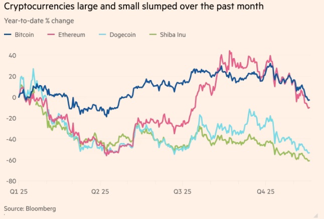 除比特幣之外,按市值排名前20的加密貨幣中,有6種今年已下跌超過40%,其中柴犬幣、Sui和Avalanche的跌幅均約爲60%。