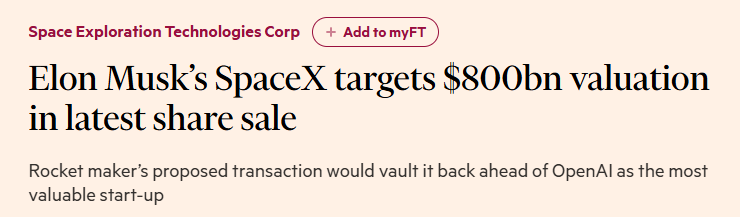 科技領域同樣迎來爆炸性消息。據《金融時報》報道,SpaceX 正與投資者洽談新一輪股權出售,目標估值高達 8000 億美元,幾乎是目前市場評估的兩倍。