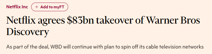 市場當天最具震撼性的新聞來自媒體行業。奈飛斥資 830 億美元收購華納被視爲近十年來好萊塢最具震撼性的交易之一,也是流媒體時代發展至今最具標誌性的轉折點。