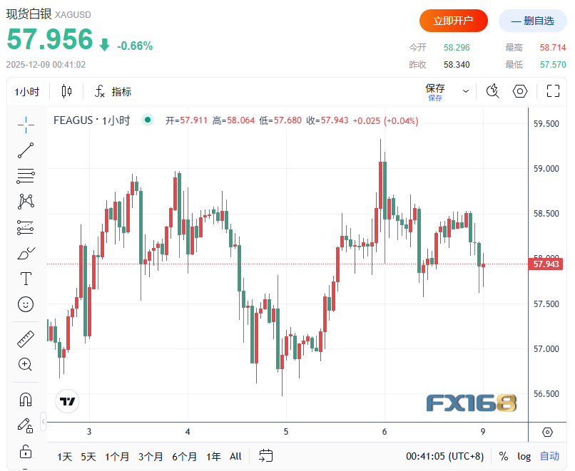 現貨白銀亦短線下挫0.6美元,至57.57美元/盎司低點。