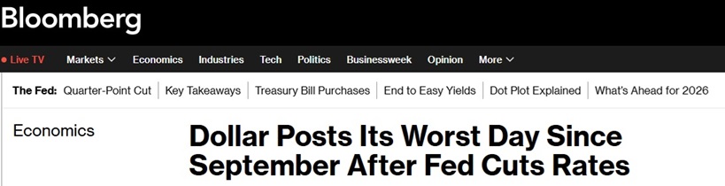 在美聯儲如市場普遍預期降息之後,美元跌至自10月下旬以來的最低水平。