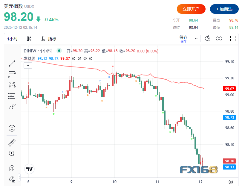 美市盤中,美元指數持續走低並跌至98.14低點,較日高回落超60點。