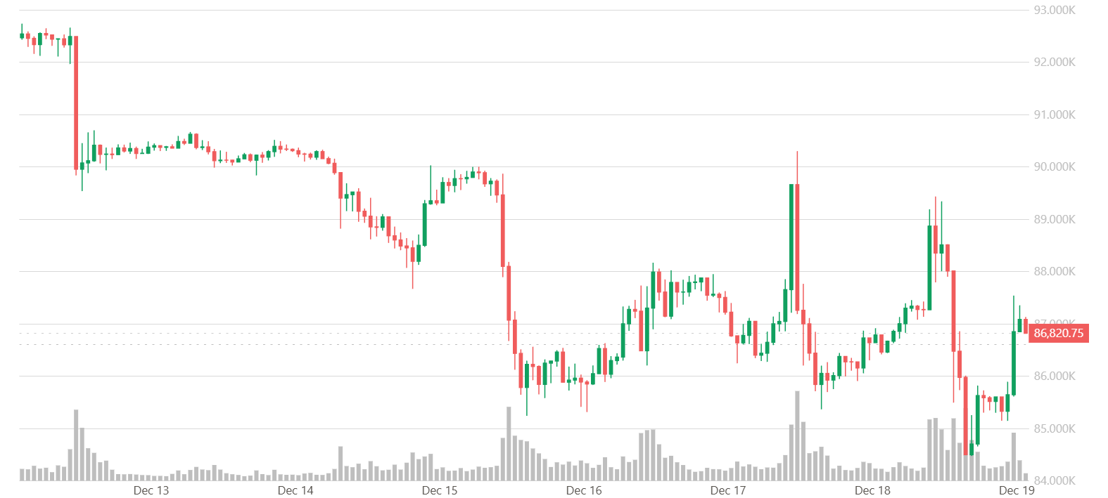 FX168財經報社(亞太)訊 週五(12月19日)在日本央行如期加息25個基點後,日元走弱,比特幣隨之走強,目前交投在8.7萬美元附近,試圖在連續兩日下跌後站穩腳跟。值得一提的是,約230億美元的期權合約將於下週五到期,恐進一步放大市場波動。