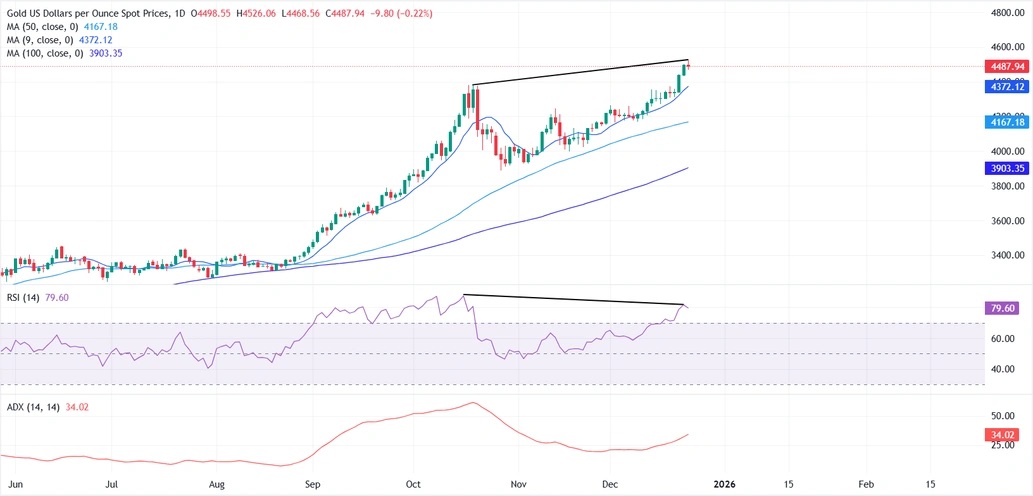 Chaturvedi補充道,上行方面,4500美元/盎司心理關口構成直接阻力,之後可能再次測試4526美元/盎司的歷史新高。若能持續突破該區域,則有望進一步漲向4600美元/盎司。與此同時,平均趨向指標(ADX)正在上升,並高於30關口,表明即使短期動能有所減弱,但潛在的趨勢依然強勁。
