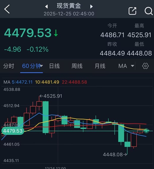 #黃金收評#24K99訊 週三(12月24日),現貨黃金盤中突破4500美元/盎司大關後,漲勢突然熄火,金價自歷史高位大幅回落,最終收盤轉爲下跌。