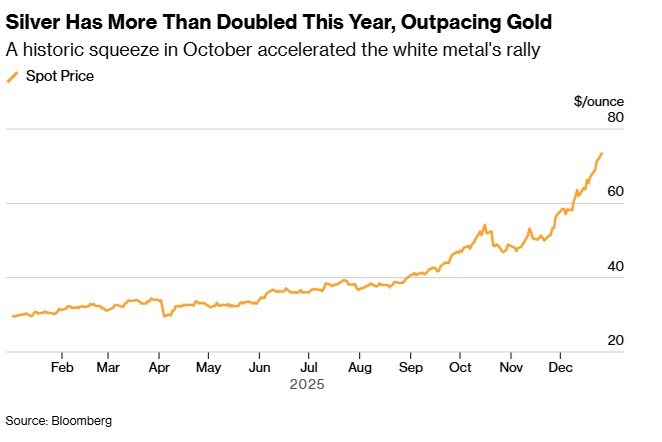 白銀的漲勢甚至比黃金更爲驚人。自10月的「逼空」事件以來,倫敦金庫出現了顯著的流入,但全球可供交易的白銀大部分仍滯留在紐約,因爲交易員正等待美國商務部就「關鍵礦產進口是否威脅國家安全」所開展調查的結果。這項調查可能導致對白銀徵收關稅或實施貿易限制。