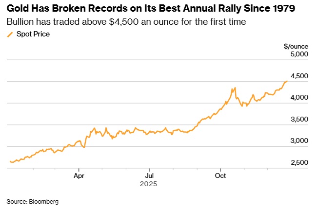 今年以來,黃金累計上漲約70%,白銀漲幅超過150%;兩者都有望創下自1979年以來的最佳年度表現。這輪火熱漲勢的支撐因素包括:各國央行持續高位增持、資金流入交易所交易基金(ETF),以及美聯儲連續三次降息。較低的借貸成本對不生息的貴金屬構成利好,交易員也在押注2026年還會進一步降息。