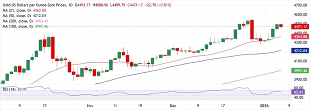 Mehta指出,在日線圖上,21日簡單移動平均線(SMA)上穿50日均線,且金價守在兩者上方,表明上漲勢頭強勁。21日均線位於4363.88美元/盎司附近,構成短期動態支撐。相對強弱指數(RSI)爲63.41,仍處於看漲區域,未進入超買區域,表明價格走勢偏向上行。