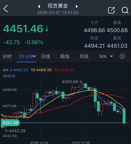 #黃金技術分析#24K99訊 週三(1月7日)亞洲交易時段,現貨黃金遭遇猛烈拋售,金價目前位於4451美元/盎司附近,日內大跌近43美元。FXStreet分析師Dhwani Mehta撰文,對金價技術走勢進行分析。