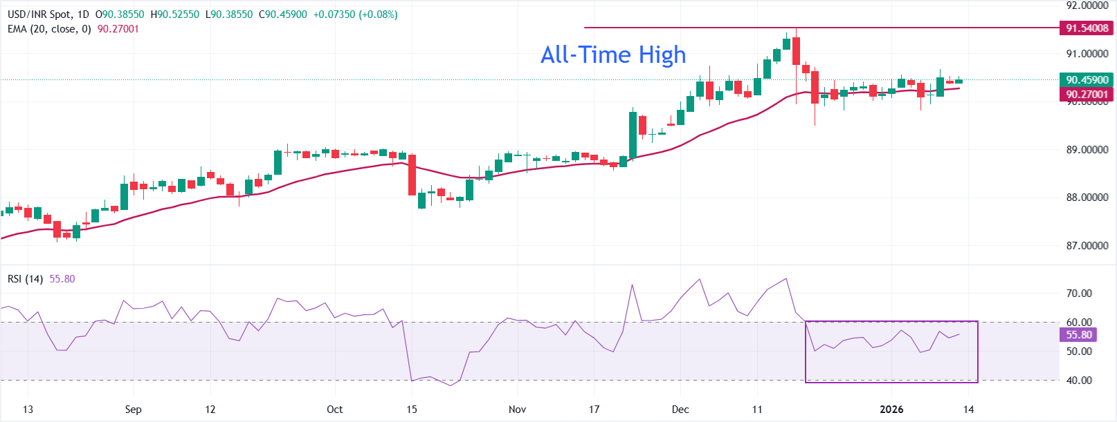 在日線圖上,USD/INR交易於90.4560。價格保持在20日EMA之上,後者小幅上升至90.2697,維持溫和的看漲偏向。上升的均線支撐回調,若跌破該均線將減緩上漲。