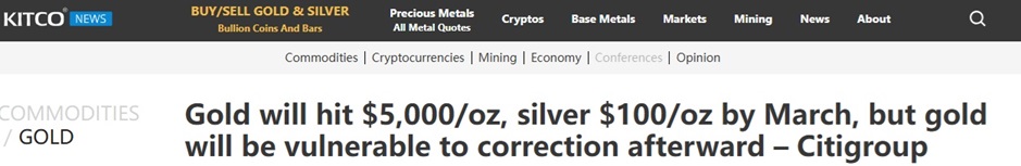 24K99訊 根據銀行業巨頭花旗集團(Citigroup)最新的預期,在3月底前,金價就會觸及5,000美元/盎司,白銀則將達到100美元/盎司,但此後黃金或更易回調。